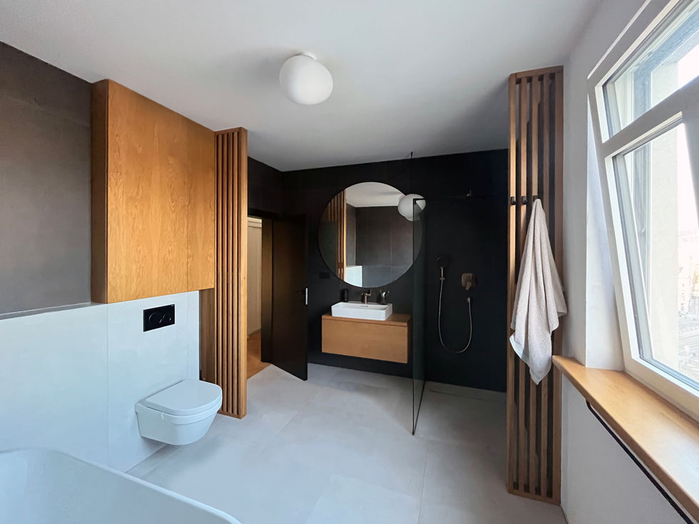Vyhliadka na Dunajskej. Panoramatický byt v nadstavbe bytového domu z 30. rokov minulého storočia. Zadaním bolo zariadiť ho bez veľkých stavebných úprav. Výzva, ktorá sa neodmieta. Panoramatická obývačka dlhá 18 široká miestami necelé 3m. Byt kde nie sú rovnobežky (ani poludníky). Vyplnili sme všetky murované niky, zjednodušili a upokojili priestor, upriamili pozornosť na výhľady všetkými smermi. Motív rôznobežnosti a výhľadov na štyri svetové strany sa zrkadlí na niektorých prvkoch vstavaného nábytku ale i tradičnej drevenej vlysovej podlahe ktorá je navyše odkazom na históriu domu, spolu so zachovaným pôvodným liatym terrazzom.